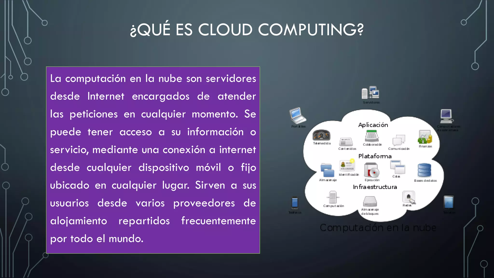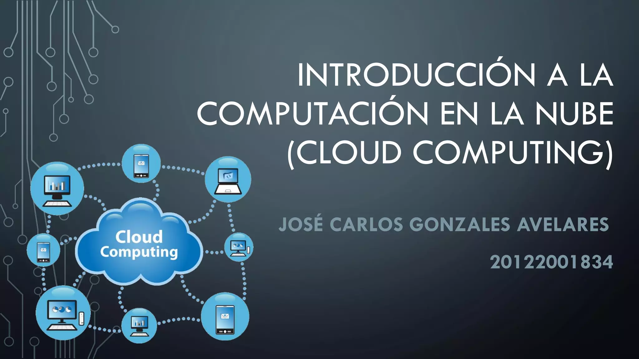 La computación en la nube permite acceder a servicios e información desde cualquier dispositivo a través de Internet. Ofrece ventajas como no necesitar equipamiento adicional y pagar solo por el uso. Existe consenso de que la nube es una tendencia tecnológica estratégica que está transformando la economía y la industria TI.