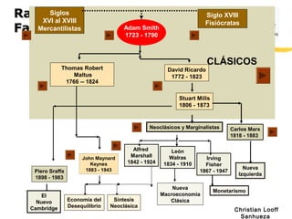 El documento resume las principales escuelas y pensadores económicos desde los mercantilistas hasta la escuela clásica. Describe brevemente las ideas fundamentales del mercantilismo, la escuela fisiócrata y sus principales exponentes como Quesnay y Francios. Luego resume las contribuciones de Adam Smith como el padre de la economía clásica y su teoría de la "mano invisible", así como las ideas de David Ricardo sobre la renta de la tierra y los costos comparativos. Finalmente, resume los aportes de Robert Malthus sobre el crecimiento