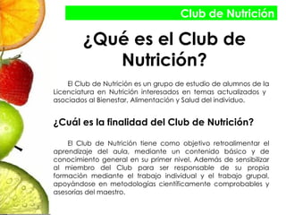 El documento presenta la información sobre un club de nutrición que se iniciará el 14 de marzo en la biblioteca universitaria. El club tendrá una duración de 10 semanas y está dirigido a estudiantes y egresados de nutrición. El objetivo del club es retroalimentar el aprendizaje académico mediante contenido básico sobre diferentes temas nutricionales como proteínas, hidratos de carbono, lípidos, necesidades energéticas y electrolitos.