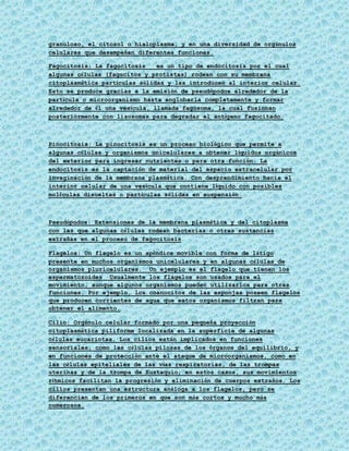 La célula es la unidad básica de todo ser vivo. Las células pueden ser unicelulares u pluricelulares. Las células eucariotas contienen un núcleo que alberga el material genético y controla las actividades celulares, y una membrana celular que rodea la célula. Dentro de la célula hay diversos orgánulos como el citoplasma y los orgánulos que desempeñan funciones como la fagocitosis, pinocitosis, producción de pseudópodos, flagelos y