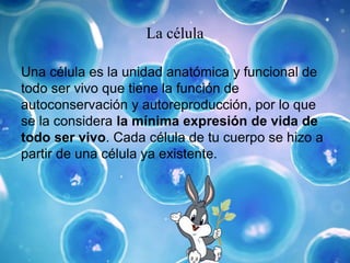Este documento describe los diferentes tipos de células, incluyendo células procariotas y eucariotas, células animales y vegetales, y explica brevemente el microscopio como un instrumento para observar células. Las células son la unidad básica de todo ser vivo y tienen la capacidad de autoconservación y reproducción. Las células eucariotas tienen un núcleo delimitado, mientras que las procariotas no tienen un núcleo definido. Las células animales son más pequeñas que las vegetales y carecen de pared