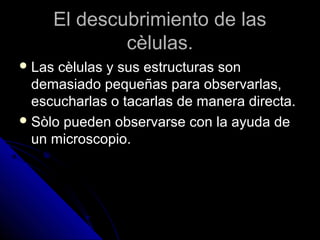 El documento describe el descubrimiento y características de las células. Explica que las primeras observaciones de células se realizaron en Europa en el siglo XIII usando microscopios y que Robert Hooke se le atribuye el descubrimiento de las células. Define las células como la unidad estructural y funcional de los seres vivos y describe las diferencias entre células procariotas y eucariotas.