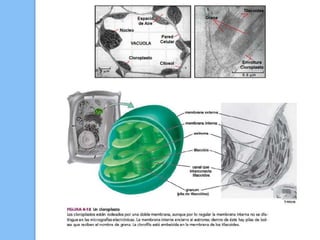 El documento describe los organelos de membranas en las células eucariotas, incluyendo retículo endoplásmico, lisosomas, peroxisomas, mitocondrias y cloroplastos, destacando sus funciones específicas y procesos metabólicos. Se enfatiza la importancia de la compartimentalización para la eficiencia celular y el flujo constante de materiales entre organelos. También se abordan roles como la detoxificación en peroxisomas y la producción de energía en mitocondrias y cloroplastos mediante respiración celular y fotosíntesis.