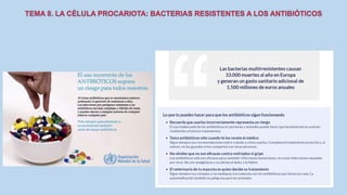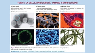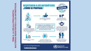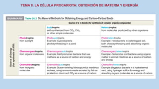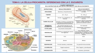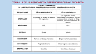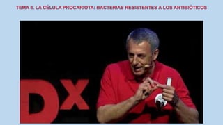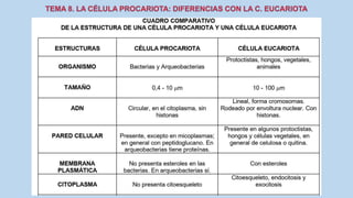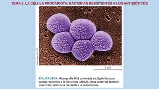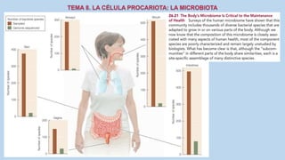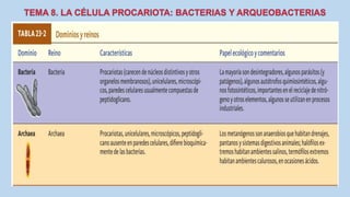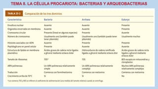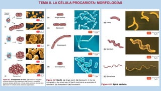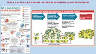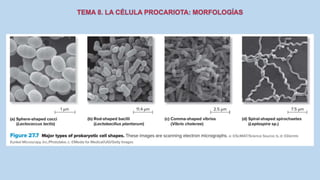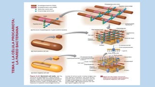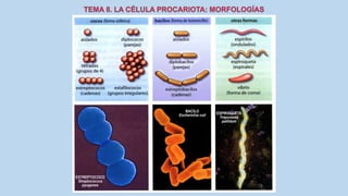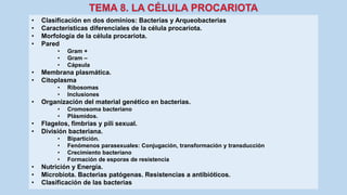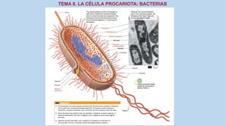 El documento describe las características de las células procariotas. Explica que las células procariotas pertenecen a dos dominios, las bacterias y las arqueas. Describe las características de la pared celular, la membrana plasmática, el citoplasma y el material genético en las bacterias, incluyendo el cromosoma bacteriano circular y los plásmidos. También cubre estructuras como la cápsula, las inclusiones citoplasmáticas y las membranas internas en algunas bacterias.