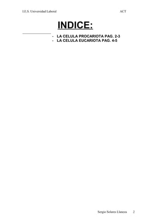Este documento describe las características de las células procariotas y eucariotas. Las células procariotas, como las bacterias, no tienen un núcleo delimitado y su ADN flota libremente en el citoplasma. Las células eucariotas sí tienen un núcleo rodeado por una membrana, así como otros orgánulos como mitocondrias y retículo endoplasmático. El documento también discute la evolución de las células procariotas primitivas a las células eucariotas más complejas que existen h