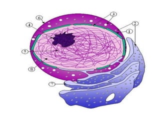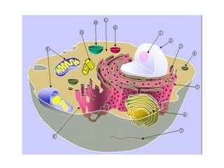 Este documento describe las características de las células procariotas y eucariotas, así como los diferentes organelos celulares. Describe la membrana celular, la pared celular, el núcleo, el retículo endoplasmático, el aparato de Golgi, los lisosomas, las mitocondrias, los cloroplastos y otros organelos importantes. Explica sus funciones en la síntesis de proteínas, metabolismo energético y otros procesos celulares.