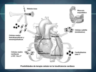 Este documento describe diferentes tipos de células madres, incluyendo sus capacidades de diferenciación, y cómo se han descubierto células madre en el corazón humano capaces de reparar tejidos dañados. También resume el primer implante exitoso de células madre extraídas de la grasa de un paciente en su corazón dañado, mejorando su función cardíaca. Finalmente, explica que las células madre mesenquimales extraídas de tejidos como el cordón umbilical y dientes ayudan a regenerar diversos tejidos en