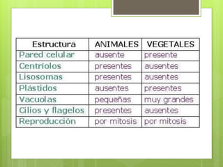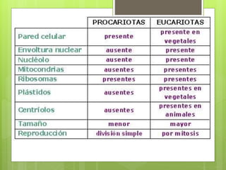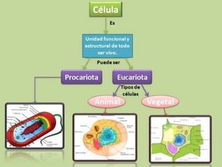 El documento describe las partes y funciones de las células animales, vegetales y procariotas. Explica que el desarrollo del microscopio permitió el descubrimiento de la célula como unidad básica de los organismos vivos y reconocer que están compuestos de una o más células. También presenta una línea de tiempo sobre los principales contribuyentes a la teoría celular.