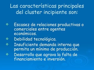 El documento describe las dos primeras fases del desarrollo de un cluster. La Fase I (cluster incipiente) se caracteriza por la falta de relaciones entre agentes económicos, debilidad tecnológica e insuficiente demanda. La Fase II (cluster articulado) ve un aumento en las actividades comerciales y las relaciones entre empresas, aunque todavía falta mejora tecnológica e institucional. Finalmente, define un cluster como una agrupación de empresas interconectadas en una misma industria y ubicación geográfica.