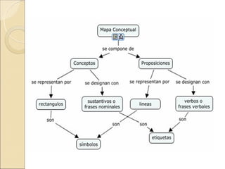 Un mapa conceptual (Cmap) es una herramienta para representar y compartir conocimiento mediante diagramas. Un Cmap contiene conceptos y enlaces que forman proposiciones para resumir ideas. Los Cmaps ofrecen beneficios pedagógicos como favorecer la comprensión y organización de la información. Su construcción requiere identificar conceptos y relaciones, y puede hacerse de forma colaborativa.