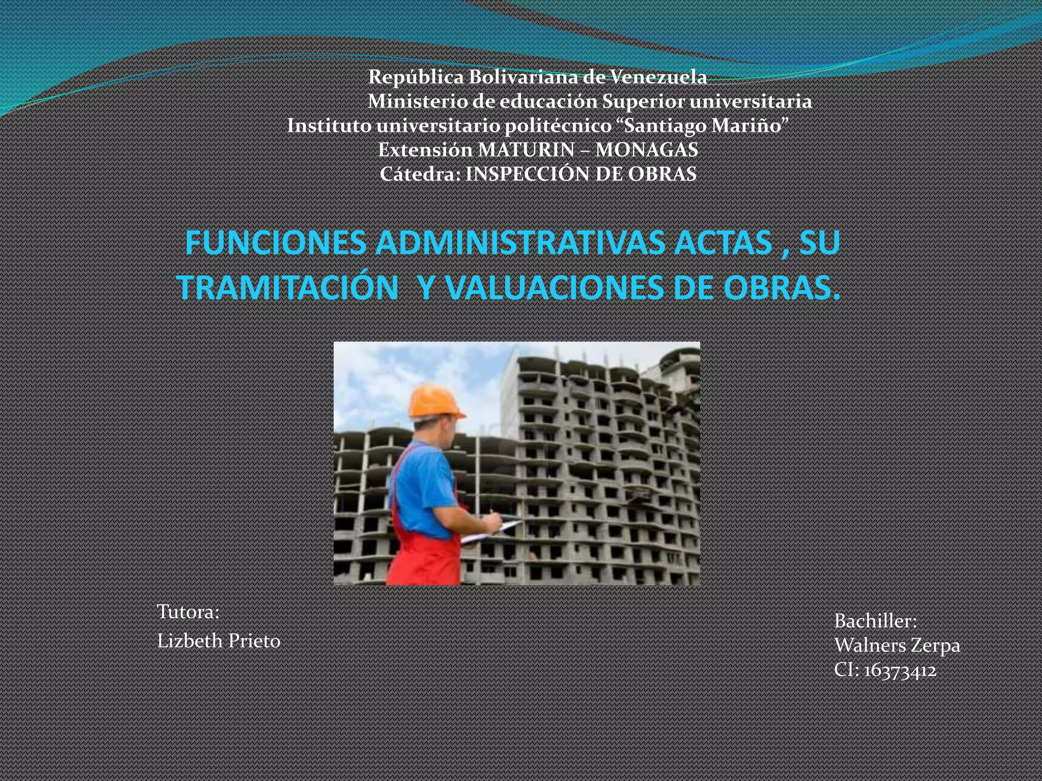 El documento presenta la información de un acta administrativa emitida por la tutora Lizbeth Prieto para el bachiller Walners Zerpa (CI 16373412) sobre las funciones administrativas de actas, su tramitación y valuaciones de obras.