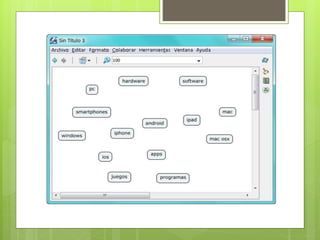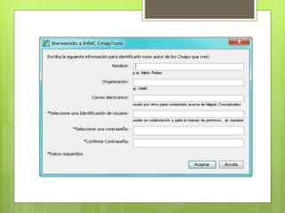Este documento proporciona instrucciones en 8 pasos para crear un mapa conceptual usando CmapTools: 1) Instalar CmapTools, 2) Introducir datos de usuario, 3) Crear un nuevo mapa conceptual, 4) Añadir conceptos, 5) Ordenar los conceptos, 6) Enlazar los conceptos con palabras de enlace, 7) Personalizar el aspecto, y 8) Guardar el mapa conceptual.