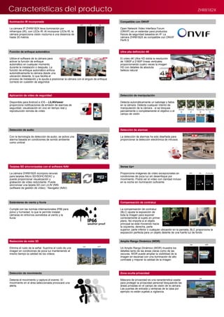 La cámara IP bala ZHR8182X ofrece grabación en 4K Ultra HD con visión nocturna de hasta 35 metros y resistencia al agua IP66. Incorpora funciones de enfoque automático, detección de movimiento y alertas de manipulación, además de ser compatible con estándares de seguridad como ONVIF. Su diseño permite la instalación en diversas condiciones ambientales y proporciona imágenes con detalles naturales y colores vibrantes.