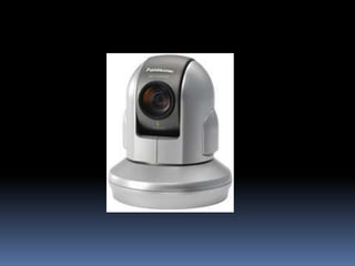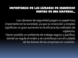 El documento describe la importancia de las cámaras de seguridad en las empresas para crear un ambiente de trabajo seguro y proteger los bienes de la empresa. También compara las cámaras de seguridad tradicionales con las cámaras IP, destacando que las cámaras IP son más compactas, funcionales, tienen mejor resolución y permiten un acceso y almacenamiento más rápido y seguro de los videos grabados. Además, presenta las características y especificaciones de algunas cámaras IP populares como la Panasonic BB