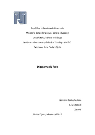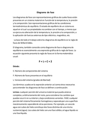 Este documento describe los diagramas de fase, incluyendo su definición, componentes y tipos. Explica que los diagramas de fase muestran las condiciones de equilibrio termodinámico de un sistema en función de la temperatura, presión y composición. También describe puntos e información clave que se pueden obtener de los diagramas de fase binarios y de un componente.