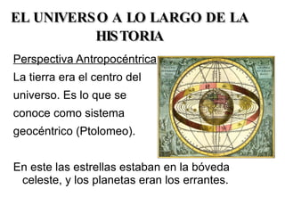 El documento resume la evolución de las ideas sobre el universo y el origen de la vida en la Tierra. Inicialmente se pensaba que la Tierra era el centro del universo, pero luego Copérnico propuso el modelo heliocéntrico con el Sol en el centro. Actualmente se acepta que el universo se originó hace 13,800 millones de años en el Big Bang. En cuanto a la vida, las teorías actuales proponen que surgió a partir de moléculas complejas que se formaron en las condiciones de la Tierra primit