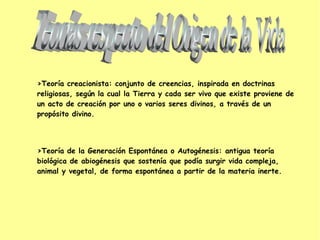 1) La teoría creacionista, que atribuye el origen de la vida a actos divinos.