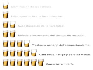 El documento describe los efectos del alcohol en el cuerpo y la salud. Explica que el alcohol afecta negativamente al cerebro, hígado, corazón y otros órganos. Si bien un consumo moderado puede tener algunos beneficios, un consumo excesivo puede causar cirrosis hepática, cáncer, accidentes y dependencia. Además, el alcohol afecta más negativamente a las mujeres que a los hombres.