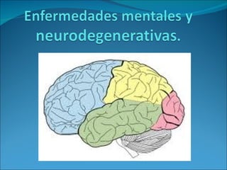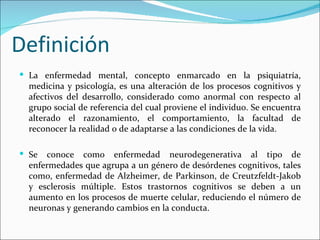El documento proporciona definiciones de enfermedad mental, enfermedad neurodegenerativa, Alzheimer, depresión, esquizofrenia y Parkinson. Describe los síntomas, etapas, tratamientos y otros detalles relevantes de estas condiciones.