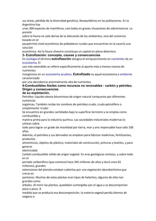El documento trata sobre varios temas ambientales como la Agenda 21, la desertificación, la eutrofización, los combustibles fósiles, la sobreexplotación de recursos, la bioacumulación, la lluvia ácida, el impacto ambiental, los factores que determinan el medio ambiente, el desarrollo sostenible, el efecto invernadero, las energías renovables, la energía nuclear y el problema de los residuos. Define estos conceptos y explica sus causas y consecuencias.