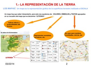 Este documento describe la representación de la Tierra en mapas y el relieve de España. Explica que los mapas usan colores, símbolos y una leyenda para mostrar características del terreno a escala. Luego describe el relieve de España, incluyendo la meseta central, montañas alrededor, y costas en su mayoría acantiladas. Finalmente, cubre el relieve de regiones específicas como Extremadura y el uso de curvas de nivel para mostrar la altura del terreno.