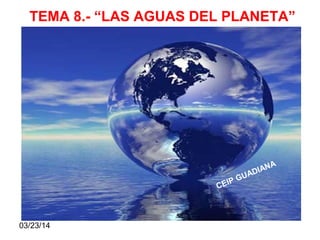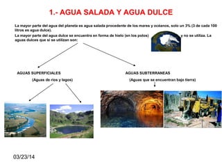 El documento describe el ciclo del agua en la Tierra, incluyendo la diferencia entre agua salada y dulce, y cómo los seres humanos obtienen agua dulce. Explica que la mayoría del agua del planeta es agua salada en los océanos, mientras que el agua dulce proviene principalmente de ríos, lagos y aguas subterráneas. También describe el ciclo hidrológico a través del cual el agua se evapora, condensa y precipita, y cómo los humanos almacenan y