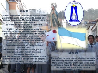 El documento presenta la información sobre el Colegio María Inmaculada en La Paz, Bolivia. Fue fundado en 1960 por Monseñor Luis Alberto Tapia y las Religiosas Misioneras del Santísimo Sacramento y María Inmaculada. Actualmente cuenta con 1,400 estudiantes y 70 miembros del personal en los niveles inicial, primario y secundario. La visión es ser líderes en la formación de personas basada en los principios de Cristo, y la misión es promover una formación integral católica centrada en valores a través de la educ