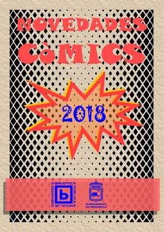 El documento lista los nuevos cómics adquiridos por la Biblioteca Pública Miguel de Cervantes en 2018, incluyendo títulos como "Ana", "Cars", "Diario de una comadreja", "Fin", "Guía fotográfica", "Saga 4-7", "Sin título", "Una una" y "Zapatillas 2", entre otros. La lista concluye con la dirección y contacto de la biblioteca.