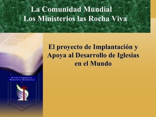 Este documento presenta La Comunidad Mundial Los Ministerios las Rocha Viva, una organización cristiana que apoya iglesias y ministros en varios continentes y países. La organización ofrece recursos como manuales bíblicos, cursos y apoyo financiero a ministros que se asocian o integran con ellos. El objetivo principal es expandir el Reino de Dios ayudando a hermanos en la fe alrededor del mundo.