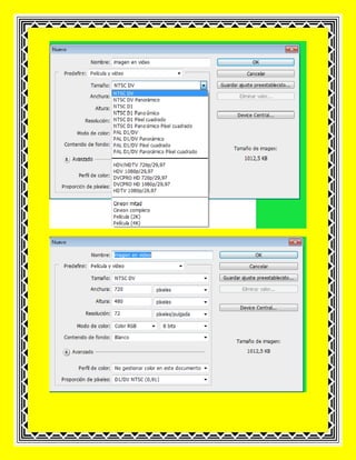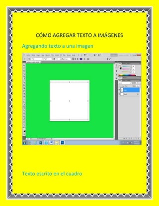 Este documento proporciona instrucciones para agregar y modificar texto en imágenes usando herramientas como las paletas Carácter y Párrafo. Explica cómo agregar texto a imágenes, aplicar estilos y formatos de texto como arcos, y guardar imágenes en diferentes formatos como JPEG, TIFF y para su uso en impresión y video.