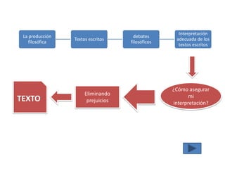 1. El documento describe varios métodos para analizar textos filosóficos de manera efectiva, incluyendo cómo hacer preguntas, dialogar con argumentos y comprender pasajes conflictivos.