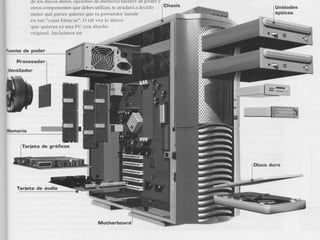 El documento proporciona una guía sobre cómo comprar una computadora personal, explicando los componentes clave como el microprocesador, la placa base, la memoria RAM, y otros periféricos esenciales. También aborda especificaciones técnicas y tipos de dispositivos necesarios para una buena experiencia informática. Se enfatiza la importancia de considerar el uso y las exigencias del equipo al momento de adquirirlo.