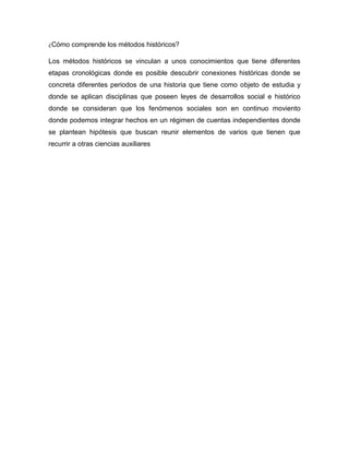 Los métodos históricos se vinculan a diferentes etapas cronológicas donde se pueden descubrir conexiones históricas entre periodos. Estos métodos aplican disciplinas sociales e históricas que consideran los fenómenos sociales en continuo movimiento, integrando hechos de manera independiente mediante el planteamiento de hipótesis y el uso de otras ciencias auxiliares.