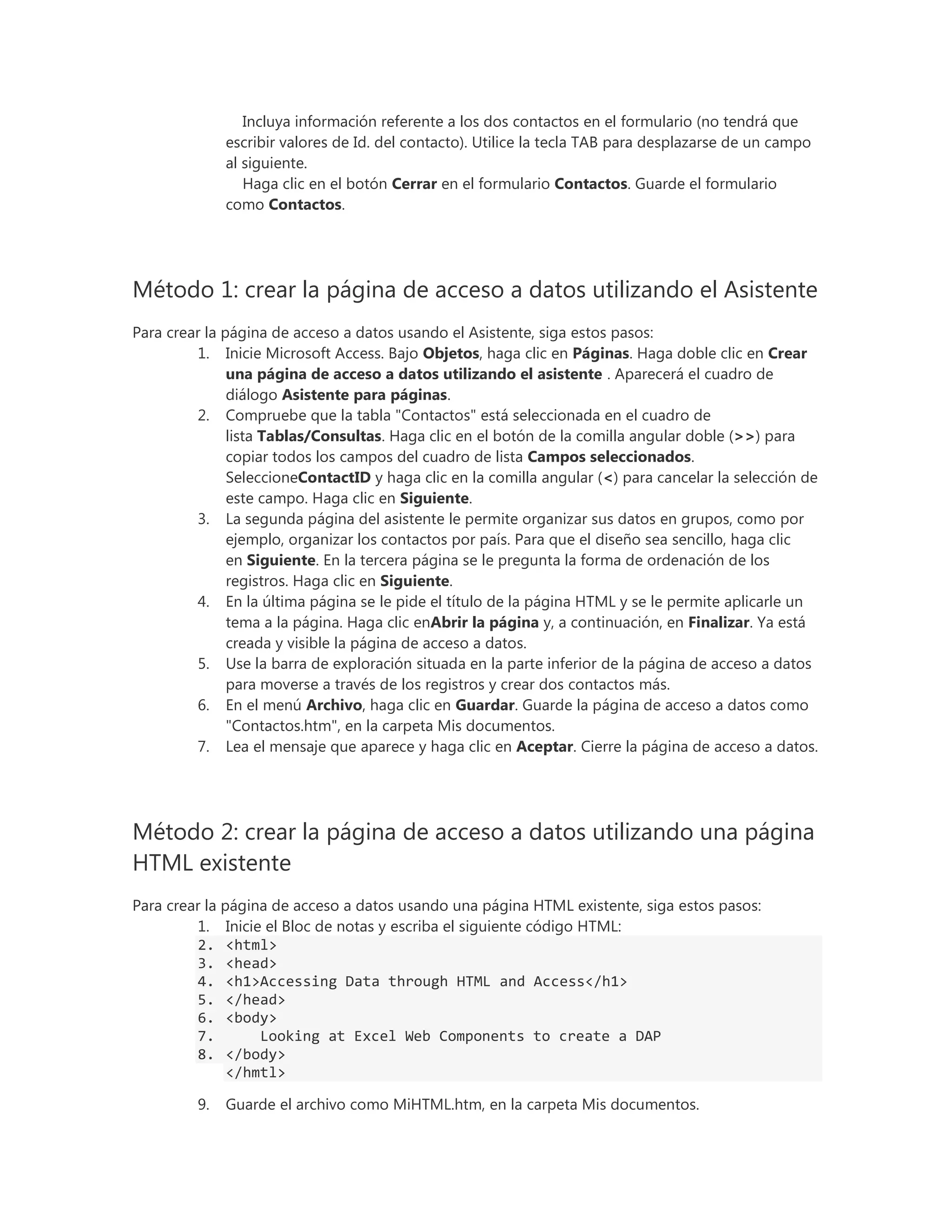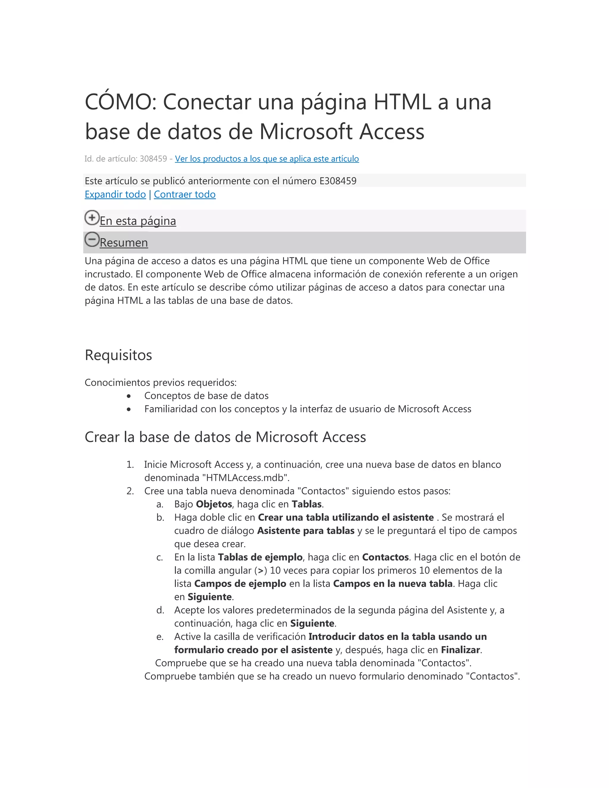 Este documento describe dos métodos para conectar una página HTML a una base de datos de Microsoft Access: 1) crear una página de acceso a datos utilizando el Asistente de Access o una página HTML existente e incluir un componente Web de Office, y 2) crear un hipervínculo en la página HTML que enlace a otra página de acceso a datos. El documento también explica cómo modificar la conexión a la base de datos o cambiar la dirección URL de un hipervínculo.