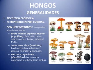 Este documento describe los hongos y sus características generales. Los hongos no tienen clorofila y se reproducen mediante esporas. Pueden vivir como saprófitos sobre materia orgánica muerta, como parásitos sobre seres vivos, o en simbiosis con otros organismos. Se describen varias setas comestibles y venenosas, con sus características distintivas. El documento también proporciona consejos sobre la recolección y el consumo seguro de setas.