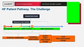 La ponencia del Dr. José Ramón González-Juanatey aborda el manejo de la insuficiencia cardíaca con fracción de eyección reducida, destacando la importancia de la iniciación y optimización de terapias médicas, incluyendo ACE-I, beta-bloqueadores y SGLT2 inhibidores. Se enfatiza la necesidad de un inicio temprano de los tratamientos para mejorar los resultados clínicos y la transición del cuidado hospitalario a ambulatorio. Además, se presentan evidencias sobre la eficacia y seguridad de medicamentos como dapagliflozina en diferentes subgrupos de pacientes.