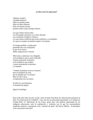 El documento ofrece consejos sobre cómo construir la esperanza. Indica que primero debes trabajar en ti mismo, amándote y aceptándote, para luego poder amar genuinamente a los demás. Afirma que sólo los que están en paz consigo mismos pueden ser fuentes de paz, y que para ayudar a otros primero debes ayudarte a ti mismo. Concluye que debes ser feliz para que tus hermanos se llenen de alegría.