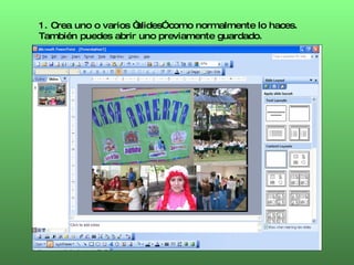 Este documento proporciona instrucciones en 5 pasos para convertir diapositivas de PowerPoint en imágenes, incluyendo guardar la presentación como PNG, seleccionar si exportar todas las diapositivas o solo la actual, y guardar la presentación original para futuras ediciones. Las imágenes creadas pueden luego insertarse en otros programas como Movie Maker o Photo Story 3 para crear presentaciones creativas sin límites como portadas o collages.