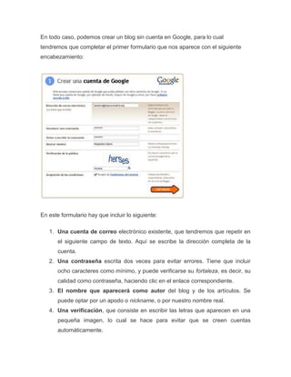 Este documento explica los tres pasos sencillos para crear un blog en Blogger: 1) Crear una cuenta con un correo electrónico y contraseña, 2) Asignar un nombre y dirección URL al blog, y 3) Elegir una plantilla de diseño. Solo se necesita seguir estos tres pasos básicos para establecer un blog gratuito en Blogger.