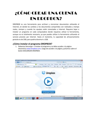 Este documento explica cómo crear una cuenta en Dropbox en 8 pasos: 1) Descargar e instalar Dropbox, 2) Aceptar los términos, 3) Seleccionar la ubicación de instalación, 4) Elegir entre iniciar sesión o crear una cuenta nueva, 5) Completar el formulario con nombre, correo y contraseña, 6) Hacer clic en Siguiente, 7) La cuenta se crea exitosamente y 8) Confirmar el registro ingresando correo y contraseña en la página de Dropbox.