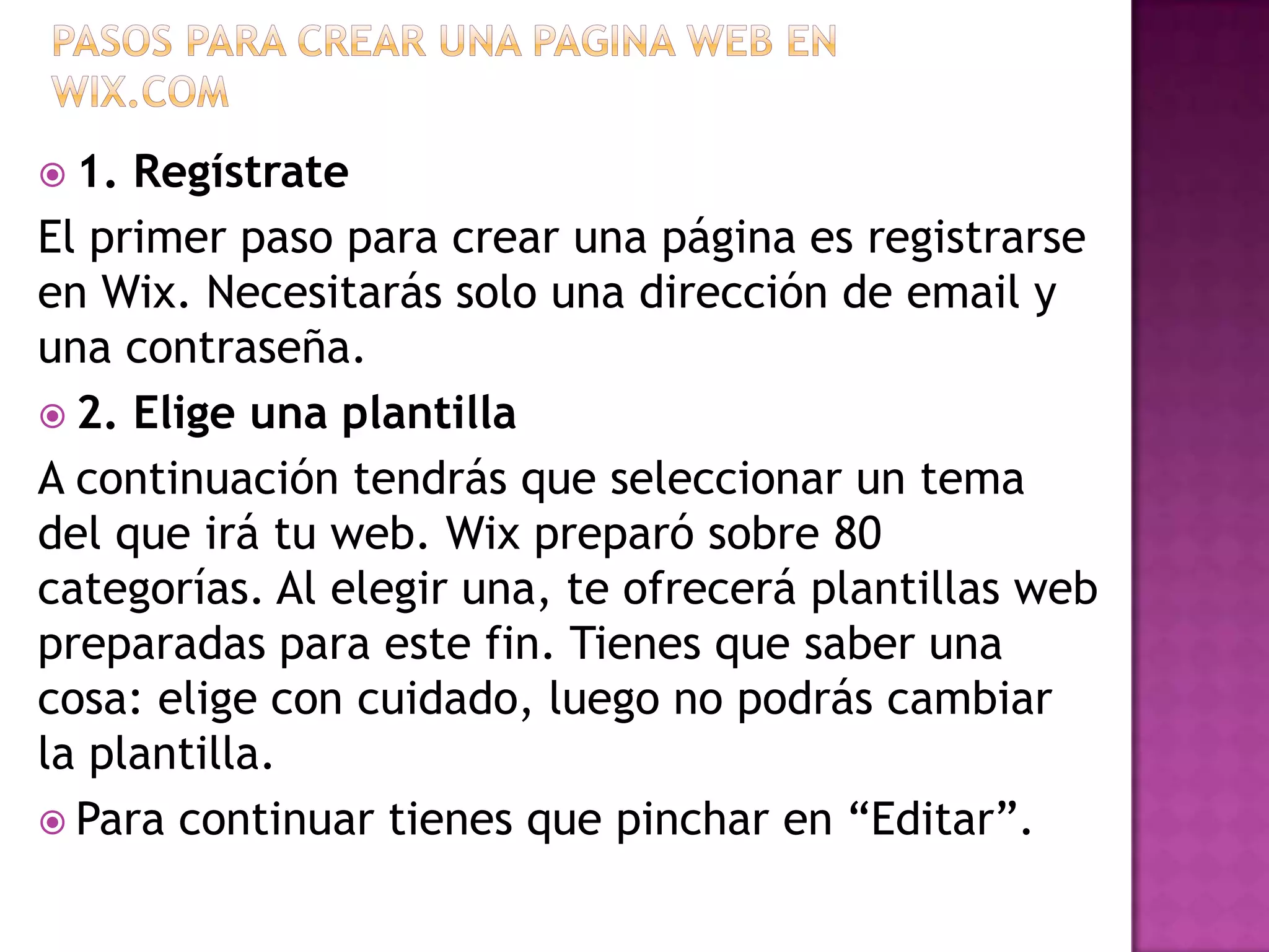 Este documento proporciona instrucciones en 5 pasos para crear una página web usando la plataforma Wix: 1) Registrarse con un correo electrónico y contraseña, 2) Elegir una plantilla, 3) Crear la estructura y jerarquía de la página web, 4) Agregar contenido como texto, imágenes, videos y formas, y 5) Publicar el sitio web eligiendo un nombre de dominio.