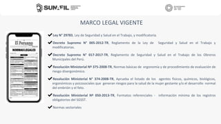 El documento proporciona información sobre la elaboración e implementación del IPERC (Identificación de Peligros, Evaluación de Riesgos y Medidas de Control). Explica el marco legal vigente, los pasos para identificar peligros y evaluar riesgos, y las medidas de prevención y control que se deben implementar. Además, incluye ejemplos de formatos y tablas que pueden usarse para elaborar el IPERC, como una matriz de evaluación de riesgos.