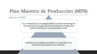 El documento explica cómo elaborar un Plan Maestro de Producción (MPS) que define fechas de entrega y cantidades a producir, optimizando la capacidad de producción y ayudando en la toma de decisiones. Se enumeran los pasos para crear un MPS, considerando aspectos como el inventario inicial, pronósticos de demanda y periodos de clientes. También se incluyen fórmulas y ejemplos prácticos para calcular el inventario final y facilitar la programación de producción.