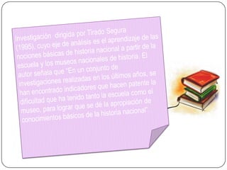 El documento describe cómo los museos pueden ser útiles para aprender historia. Los museos albergan objetos que emiten mensajes fundamentales para comprender la historia y engendran historias a través de las colecciones. Asimismo, los museos son una forma masiva de difundir el saber histórico al público no especializado. No obstante, su potencial como herramienta educativa no ha sido totalmente aprovechado.