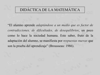 La resolución de problemas y la reflexión posterior sobre los conocimientos involucrados, las estrategias empleadas y los errores cometidos son fundamentales para el aprendizaje de las matemáticas según la didáctica de la matemática. Los problemas deben permitir a los estudiantes utilizar sus conocimientos previos de manera que no encuentren una solución inmediata. Los juegos también pueden ser útiles como recurso didáctico si se enfocan en objetivos claros de enseñanza y generan discusión sobre lo aprendido.