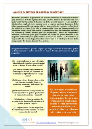Este documento discute la importancia de evaluar el sistema de control de gestión de una empresa. Señala que un sistema de control de gestión eficaz permite medir el rendimiento de una empresa, tomar mejores decisiones y anticipar problemas. Para evaluar el sistema, una empresa debe verificar que cuenta con indicadores clave, un sistema de información para la toma de decisiones, y que el responsable de control de gestión tiene las funciones adecuadas. Un sistema de control de gestión deficiente puede poner en riesgo el rendimiento de una empresa.
