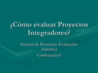 El documento proporciona orientaciones para la evaluación de proyectos integradores, incluyendo el uso del ciclo de planificación, ejecución, verificación y acción. Recomienda que los proyectos impliquen la solución de problemas reales y colaborativos que desarrollen habilidades cognitivas, afectivas y metacognitivas en los estudiantes. También destaca la importancia de criterios como la profundidad teórica, aplicación de métodos de investigación, trabajo en equipo y coherencia en la expresión y presentación.