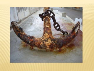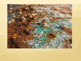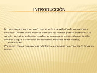 La corrosión es la oxidación de materiales metálicos que causa problemas económicos. Para evitar la corrosión, se debe seleccionar materiales resistentes como el acero inoxidable y aplicar recubrimientos protectores como pintura. Algunos métodos de protección incluyen recubrimientos metálicos, protección catódica y el uso de aleaciones con elementos de adición.