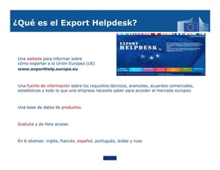 Este documento proporciona información sobre los requisitos para exportar alimentos a la Unión Europea. Explica las normas de seguridad alimentaria, etiquetado, contaminantes, residuos de plaguicidas y normas de comercialización que deben cumplirse. También describe los controles que se realizan a la entrada de la UE y los pasos que debe seguir un exportador para garantizar el cumplimiento de la legislación europea.