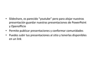 SlideShare permite a los usuarios subir presentaciones de PowerPoint y PDF para compartirlas con otros a través de un enlace. Los usuarios deben crear una cuenta para obtener un espacio de almacenamiento personal donde pueden cargar sus presentaciones. Una vez que se sube una presentación, el usuario proporciona un título, descripción, etiquetas y categoría para mejorar la búsqueda de la presentación por otros.